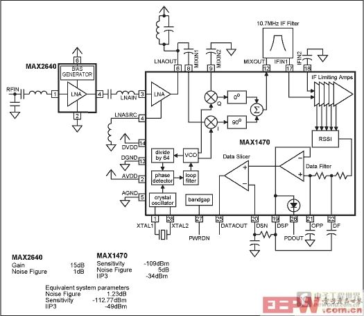 假定原灵敏度是-109dB,加上LNA后仅仅获得了3.77dB的提高。考虑三阶交调截点(IIP3)对动态范围的影响,MAX1470有16dB的内部LNA增益和-18d
