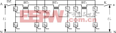 S1~S12固态继电器,其中S1~S4与BT1、S5~S8与BT2、S9~S12与BT3分别组成三个功率全桥电路。其工作过程如下:若由于输入电压Ui升高等原因造成输出电压Uo高于额定值,要求BT1、BT2、BT3中一个(2个或3个)工作,产生反极性电压抵消Ui升高的那部分电压,如经主控板判断需BT1投入时,可触发S1、S4道通。当Uo低于额定值时,需要BT1产生顺极性电压补足Ui所缺的那部分电压,可使S2、S3触发通道。以此类推,如果Ui升高或降低较多时,可使BT1、BT2、BT3同时投入工作,产生较高的反极性或顺极性补偿电