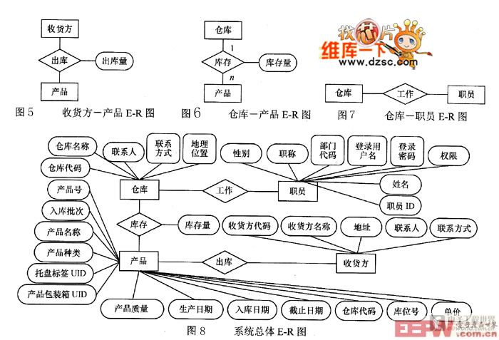 仓储管理信息系统涉及的实体如下。(1)仓库:属性有仓库代码、仓库名称和联系方式。(2)产品:属性有产品号、入库批次、产品名称、产品种类、托盘标签UID、产品包装箱UID、产品质量、生产日期、截止日期、入库日期、仓库代码、库位号、单价。(3)职员:属性有职员代码、姓名、性别、职称、部门代码、登录用户名、登录密码和权限。(4)收货方:属性有收货方代码、收货方名称、收货方地址、联系人和联系电话。