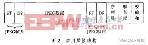 应用层成帧模块将图像帧封装成应用层帧,并添加序列号、帧长度与校验和到帧尾(见图2),用来在接收和显示端检测不同类型的错误。摄像头输出的JPEG 图像自带帧头与帧尾标识,帧头为0xFFD8,帧尾为0xFFD9。
