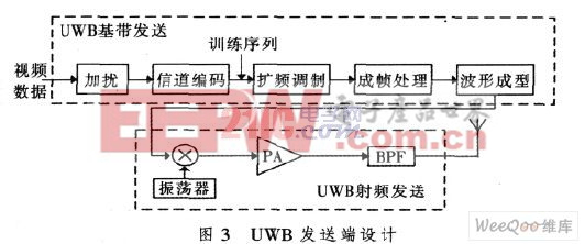 的视频数据通过扰码增加伪随机性,再经过信道编码,插入训练序列后进行扩频调制,之后完成物理层成帧处理,再经过波形成型滤波器,发往射频发送模块。在射频发送模块,经过基带处理的数据通过混频器调制到射频,然后经由功率放大器(PA)和带通滤波器(BPF),由天线发射出去。