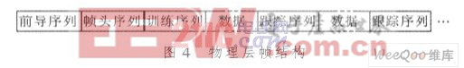 相对于接收端,UWB 发送端结构简单,易于小体积、低功耗的实现。为了满足传输性能的需求,在信道编码模块采用了RS 码与卷积码的级联码配合交织,提高纠错能力,对抗突发错误。在扩频调制之前插入训练用PN 序列,方便接收端均衡器的自适应调整。扩频调制使用BPSK调制方式,选择扩频比为2。扩频调制之后的成帧处理,加入了前导序列、帧头序列以及跟踪序列(见图4),以便接收端完成捕获、同步和跟踪的重要任务。这3 个序列同样使用PN 序列。滤波成型使用了根升余弦滤波器,选择滚降系数为1,使频带内发射功率尽可能大。
