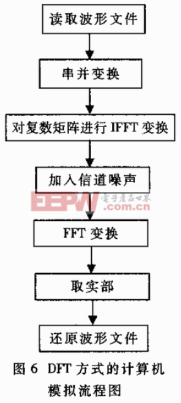 在傅立叶变换方式中,使用快速傅立叶算法,直接对每帧数据进行IFFT,得到已调序列。在接收端对接收到的序列进行FFT,还原出原始数据。程序流程图如图6所示。