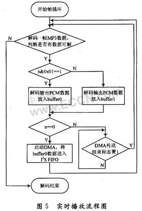 该系统采用双Buffer轮换DMA传送的方案实现实时播放,整个播放流程如图5所示。其中n为解码当前帧的帧序号,第一帧序号为0;buffer0和buffer1分别用于存放当前播放帧的PCM数据和下一帧的PCM数据。DMA传送采用LLI传送方式,可实现将2个buffer存放的PCM数据轮换向I2S FIFO传送,因此只需在解码完第1帧后启动一次DMA传送。