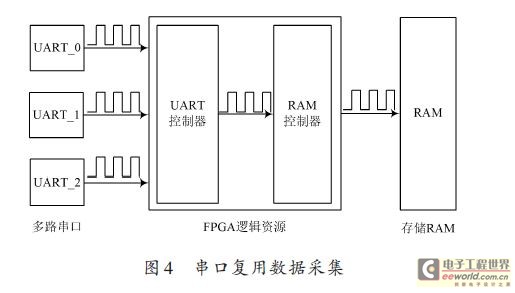 当多路串口中任何一路,任何时候到来数据的时候,UART 控制器都能感知这次串行数据,并开通相应的信道,将某一路的串口数据送到RAM 控制器。然后RAM 控制器将该信道的串行数据写入RAM 中。这样就可以完成对多路串口数据的采集工作。