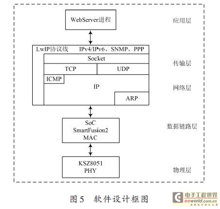 软件设计框图如图5 所示,WebServer 进程和网页进行通信,通信的协议采用LwIP 协议,对于LwIP 协议使用其中的IPv4应用层,使用TCP/IP 传输,DHCP 动态获取IP,数据链路层使用内部的MAC,采用100 Mb/s的MII接口和PHY通信,PHY在物理层上和PC机通信[8].