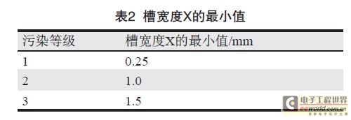 电性污染变为导电性污染;污染等级4:造成持久的导电性污染,例如由于导电尘埃或雨或其他潮湿条件所引起的污染。由于以上轨迹线之间沿绝缘材料表面上可能存在槽或缝,这样会导致漏电距离和电气间隙的路径并不完全一样,有时甚至是截然不同的两条路径。槽或缝的宽度如果小于一个定值X时,测量漏电距离时槽或缝的深度是可以忽略不计的。但这个定值X是由污染等级决定的。所以说污染等级会直接影响漏电距离的路径。槽宽度X基本上适用于以污染等级为函数的所有情况见表2.