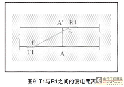 T1与R1之间的电气间隙即T1与R1间视线最短处距离,T1沿三角形边至角A距离为AB,R1沿三角形边至角A距离为,印制线路板的厚度为T,T1与R1之间的电气间隙BC=√(A'C+T2)+AB2 ,如图8所示,图中虚线为电气间隙路径,实线为漏电距离路径。T1与R1之间漏电距离如图9所示,以A-A′为轴将该部分印制电路板的竖直镂空面逆时针方向水平展开俯视,即得详细路径图。这些组数据都可以通过显微镜测量得到。