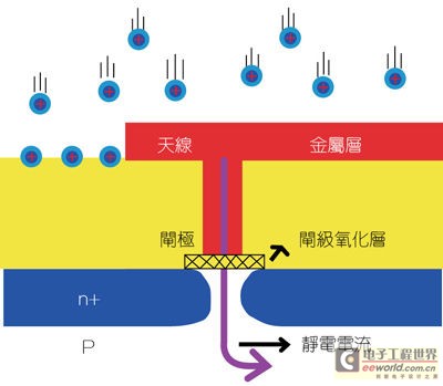 电浆充电损害是指在电浆处理过程中,在MOSFET闸级氧化层上发生非预期的高场应力。在电浆蚀刻过程中,大量电荷聚集在多晶矽和金属表面。透过电容器耦合,在闸级氧化层中会形成较大电场,导致产生可能损害氧化层并改变设备阀值电压(VT)的应力。如下图所示,被聚集的静电荷被传输到闸极中,透过闸级氧化层,被电流穿隧中和。