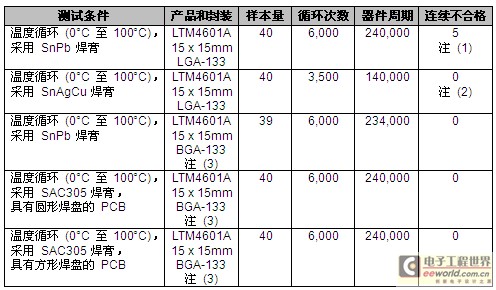 注 (2):采用 SAC305 (无铅) 焊膏进行的更多后续 LGA 产品测试 (至 6000 个周期) 显示:在总共 240 个其他不同的 μModule 产品样本中故障率为零。
