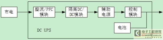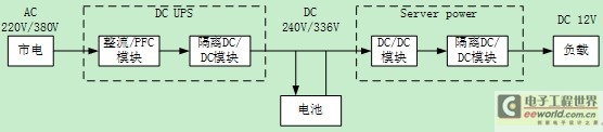 在UPS应用的另外一个分支是目前正在兴起的直流UPS系统。直流系统的思路是出于提高效率的目的,减少电源系统中间的转换环节,电力分配部分由原来的交流转换成直流。一个理想的直流UPS系统服务器应用从市电到12V终端的应用结构见下图: