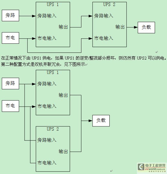 对于一般的UPS系统应用来说,存在两种常见的配置方式,一种是双机热备份,见下图所示: