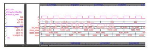 在之前提到邊界處理器需要利用到暫存器並位移。如圖5.4所表示,R1、R4、R7、R10分別為DIN_1延遲一個、兩個、三個及四個時脈週期;R2、R5、R8、R11分別為DIN_2延遲一個、兩個、三個及四個時脈週期;而R3、R6、R9、R12分別為DIN_3延遲一個、兩個、三個及四個時脈週期。