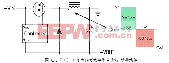 图5.1显示了一款精简型降压—升压电路,以及电感上出现的开关电压。这样一来该电路与标准降压转换器的相似性就会顿时明朗起来。实际上,除了输出电压和接地相反以外,它和降压转换器完全一样。这种布局也可用于同步降压转换器。这就是与降压或同步降压转换器端相类似的地方,因为该电路的运行与降压转换器不同。