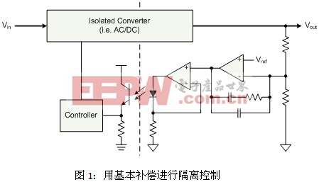 那么,为什么这会对电源设计有用呢?下面我就来一步步分析。看看您的家庭或办公室,您会发现各种电子系统,大多数电子系统乃至全部电子系统都要通过电源将较高的AC电压转变为较低的DC电压。为了安全,这种转换过程需要高度隔离。这里需要考虑一个进退两难的问题,大多数开关电源都必须在没有DC电流的空隙上调节输出。怎么调节输出呢?解决这个问题的常见经典方法就是结合误差放大器和补偿网络以及偏置光耦合器,如图1所示,实现安全空隙的桥接。这是一个比较简单的例子,并不能描述所有可能的隔离设计情况,不过这也能说明问题。