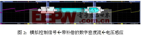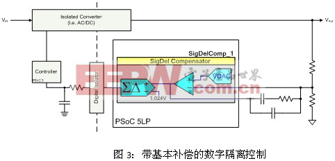 这样,图1中的模拟理念转变成了图3所示的数字理念。光耦合器被数字隔离器所取代。这样,偏置或部件差异问题基本就不存在了,至少对我所用的这个数字隔离器来说是这样。偏置电路也被消除。Sigma-Delta调制器与模拟补偿和可编程参照生成功能相结合,形成一种适用于电源应用的小型混合数字与模拟控制策略。这样做的好处在于可将功能集成在单一可编程SoC上。集成优势还不仅限于此,可编程SoC还包括数字处理以及可编程数字功能。