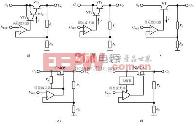 a)传统的NPN型稳压器 b)准低压差线性稳压器(QLDO) c)低压差线性稳压器(LDO) d)PMOS超低压差线性稳压器 e)NMOS超低压差线性稳压器
