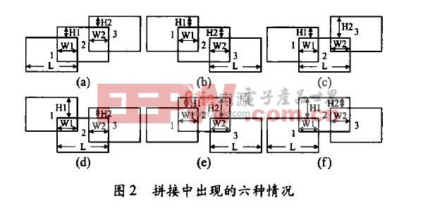 实际过程中,由于机械平台加工的精度问题,3个相机可能不在同一水平面上,并且相邻两相机的重叠像素部分也不一定相同,就造成常规数据传输中有错位现象产生。根据实验与分析,拼接过程中会出现6种可能情况,如图2(a)、2(b)、2(c)、2(d)、2(e)、2(f)所示。