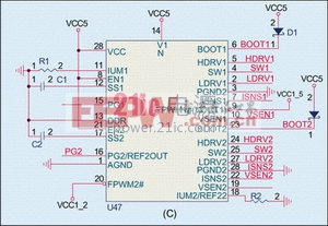 对于低电压大电流的情况一般会用PWM的方式来实现电源转换,因此最开始的设计采用PWM来实现1.2V和1.5V电源的转换,均采用单相。采用合适的 PWM控制器可以直接控制两路电源的输出,电路如图1所示,这种拓扑结构在主板上应用广泛,从CPU的电源供电到DDR的电源和终端供电都是通过该方式实现的。这是一种很成熟的电源转换方式,可以很可靠地实现低电压大电流的转换。