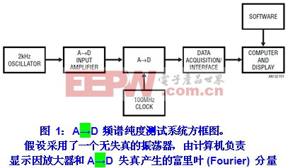 图 1 给出了系统的示意图。一个低失真振荡器通过一个放大器来驱动 A→D。A→D 输出接口对转换器输出进行格式化,并与负责执行频谱分析软件和显示结果数据的计算机进行通信。