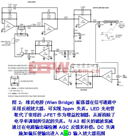振荡器是系统中难度最大的电路设计部分。为了对 18 位 A→D 进行有意义的测试,振荡器的不纯度必须超低,而且这些特性必须采用独立的方法加以验证。图 2 基本上是一款“全反相”2kHz 维氏 (Wien) 电桥设计 (A1-A2),其在哈佛大学 Winfield Hill 所做研究工作的基础上进行。原始设计的 J-FET 增益控制被一个 LED 驱动的 CdS 光电管隔离器所替代,从而消除了由 J-FET 电导率调制引起的误差,同时也就不必为最大限度地减少这些误差而进行微调。限带的 A3 负责接收 A2 输出和 DC 失调偏置,并通过一个 2.6kHz 滤波器提供输出以驱动 A→D 输入放大器。用于 A1-A2 振荡器的自动增益控制 (AGC) 信号由负责给整流器 A5-A6 馈电的 AC 耦合 A4 从电路输出 (“AGC 检测”) 获取。A6 的 DC 输出表示电路输出正弦波的 AC 幅度。利用终接至 AGC 放大器 A7 的电流求和电阻器来使该数值与 LT®1029 基准保持平衡。驱动 Q1 的 A7 通过设定 LED 电流 (因而还包括 CdS 光电管电阻) 来闭合增益控制环路,从而稳定振荡器输出的幅度。尽管这会衰减 A3 和输出滤波器的带限响应,但从电路的输出获得增益控制反馈信息可保持输出幅度。另外,它还对 A7 环路闭合动态特性提出了要求。确切地说,A3 的频带限制与输出滤波器 A6 的滞后及纹波抑制组件 (在 Q1 的基极中) 相组合,可产生显著的相位延迟。A7 上的一个 1μF 主极点和一个 RC 零点一起提供了该延迟,从而实现了稳定的环路补偿。这种方法用简单的 RC 滚降滤波器取代了严密调谐的高阶输出滤波器,从而在保持输出幅度的同时最大限度地降低了失真1。