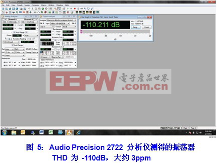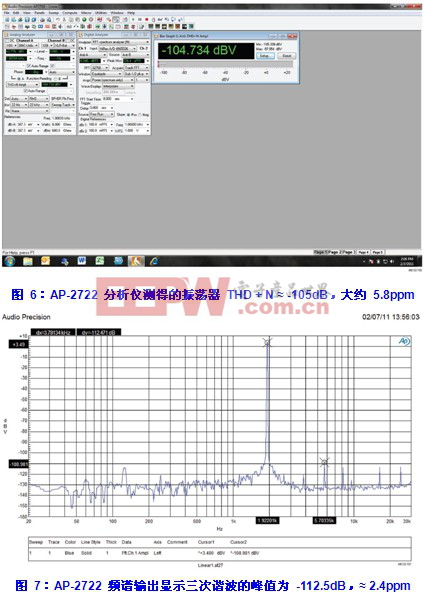 验证振荡器失真需要采用精细的测量方法。尝试采用传统失真分析仪 (甚至是高级型分析仪) 来测量失真会遭遇局限性。图 4 示出了振荡器输出 (扫迹 A) 及其在分析仪输出端上的残留失真指示 (扫迹 B)。在分析仪的噪声层和不确定性层中,振荡器相关动作的轮廓描绘是模糊不清的。测试中使用的 HP-339A 规定了一个 18ppm 的最小可测量失真;这张照片在拍摄时仪器的指示为 9ppm。这超过了规格指标而且非常可疑,因为在测量失真时如果达到或接近了设备的性能极限,就会带来显著的不确定性2。假如要对振荡器失真进行有意义的测量,则必需使用不确定层非常低和精致的专业型分析仪。规定了 2.5ppm 总谐波失真 + 噪声 (THD + N) 限值 (典型值为 1.5ppm) 的 Audio Precision 2722 提供了图 5 中的数据。如该图所示,总谐波失真 (THD) 为 -110dB,即大约 3ppm。图 6 (使用相同的仪器获得) 示出的 THD + N 为 105dB,即 5.8ppm 左右。在图 7 所示的最终测试中,分析仪确定了振荡器的频谱成分 (以三次谐波为主导,位于 -112dB,即大约 2.4ppm)。这些测量值使人们有信心把该振荡器应用于 A→D 保真度特性分析中。