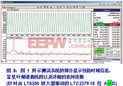 A→D 测试通过其输入放大器将振荡器输出发送至 A→D。此项测试测量了由输入放大器 / A→D 组合所产生的失真分量。A→D 输出由计算机来检查,计算机将以定量的方式把频谱误差分量指示在图 8 的显示界面中3。该显示界面包含了时域信息 (其示出了集中于转换器工作范围内的偏置正弦波)、一个富里叶变换 (指示了频谱误差分量) 和详细的表列读数。被测试的 LTC®2379 18 位 A→D / LT6350 放大器组合产生了 -111dB (约 2.8ppm) 的二次谐波失真,而较高频率的谐波则远低于该水平。这表明 A→D 及其输入放大器处于正确的运作状态和规格范围之内。要想实现振荡器与放大器 / A→D之间的谐波消除,则必需测试多个放大器 / A→D 样本以增加测量的置信度4。 注 1:这有點类似于使食物通过绞肉机来制作浓汤。