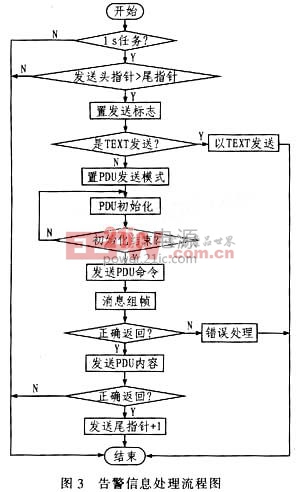 通信线路均采用屏蔽双绞线屏蔽外界干扰,并进行光电隔离。并将各范围内的模拟量输人信号统一转换为0 V~4 V的电压信号送至A/D转换器,为了提高系统抗干扰能力,采用差动放大器和隔离放大器。 2.2.2接地 信号接地保证同一逻辑系统的信号逻辑准确,消除同一逻辑系统的不等电位带来的干扰,保护接地保证了系统各部分的安全工作。而数字信号地和模拟信号地单点连接。信号地和大地采用3KV102电容连接。 3系统软件设计 3.1软件设计思路 采用实时操作系统,即定时器T0产生10 ms中断,利用10 ms中断计数分别产生200 ms、500 ms和1 s任务。系统软件模块框图如图2所示。 3.2短消息模块无线传输 短消息模块无线传输分为告警信息主动上传和被动召唤。告警信息是主动上传,而遥控、遥测和遥调则是通过短消息召唤或控制实现的。告警信息处理流程如图3所示。 告警分为遥信告警和遥测告警。遥信告警实现方法:定义若干位为告警位,需产生告警的遥信接至该位置上,一旦触发该位置遥信,则产生告警信息。 短消息模块的告警信息必须以汉字发送。而每个汉字采用UNICODE编码,占两字节,如电0x7535子0x5b50。将汉字转换成UNICODE编码在单片机下编程比较困难。因为直流电源监控的告警信息有限,并且微软的操作系统提供该类函数,所以需将所有用到的汉字以表的方式写入代码空间。根据直流系统不同的告警代码直接查取告警信息的UNICODE编码。遥控遥调信息处理流程如图4所示。 遥控、查询测量信息是以TEXT方式发送。当短消息模块接收下列格式的短消息后,并且密码正确,就将召唤直流电源信息按照接收号码返回短消息或者下发遥控命令,返回控制结果。 短信内容格式:;密码;功能码(;内容1)(;内容2)(;……)。其中,密码为6个字符/数字;功能码包含2个字符,如表1所列;内容长度不定。如:查询系统测量信息短信内容格式:;1234156;01;遥控设备开关机格式:;123456;02。 4 结束语 本系统设计实现直流电源的遥控,遥调输出和遥信、遥测输入。针对直流电源传输信息少的特点扩展了短消息模块,为直流电源监控设计了无线传输方案。基于短消息传输的电源监控系统无需构建额外的无线通信网络,而是通过现有的覆盖面广,运行稳定的网络进行专用的无线数据传输。