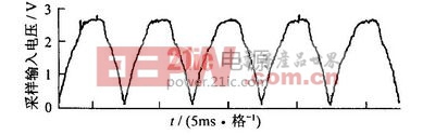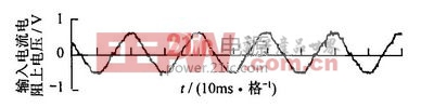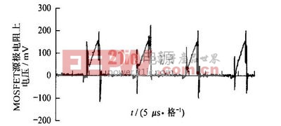 实验结果显示该AC/ DC 变换器在较宽广的输入电压范围下获得高度稳定的直流电压400 V 输出,纹波峰峰值在8 V 以下,输出额定功率达150W ,满载下效率η= 95 % ,功率因数λ≥0. 99 ,输入电流总谐波畸变D 6 %. 图4 和图5 所示记录了芯片3 脚的采样输入电压、交流输入电流波形. 图6 所示为MOSFET 上源极电阻上的采样电压波形,它反映了流经MOSFET 上的电流波形,即电感储能阶段电感电流波形. 可看出由于MOSFET 开关频率很高(将近70 kHz) ,在开关关断过程中源极电阻上有较强的干扰电流流过,示波器记录波形上出现不少尖峰毛刺. MC33262 芯片内已预先设置了RC滤波器对该信号做滤波处理,不过一般可在4 脚与源极电阻间考虑再增添一外部RC 滤波电路,增强抗干扰效果. 图4 芯片3 脚电压采样输入波形 图5 输入电流电阻采样波形 图6 MOSFET上导通电流电阻采样波形 4 结语 由MC33262 构成的功率因数校正电路外围结构简单,电路元器件少,电路的体积和成本下降,提高了系统的可靠性. 目前这种APFC 技术已经在开关电源、电子镇流器等诸多领域得到了应用. 该APFC 电路采用峰值电流控制方式,属于准连续电流模式,MOSFET 开关频率很高,这对EMI 滤波电路的设计有较高的要求. 不过该系列芯片与其他采用连续模式的APFC 芯片相比有着较高的性价比,值得作进一步完善研究.