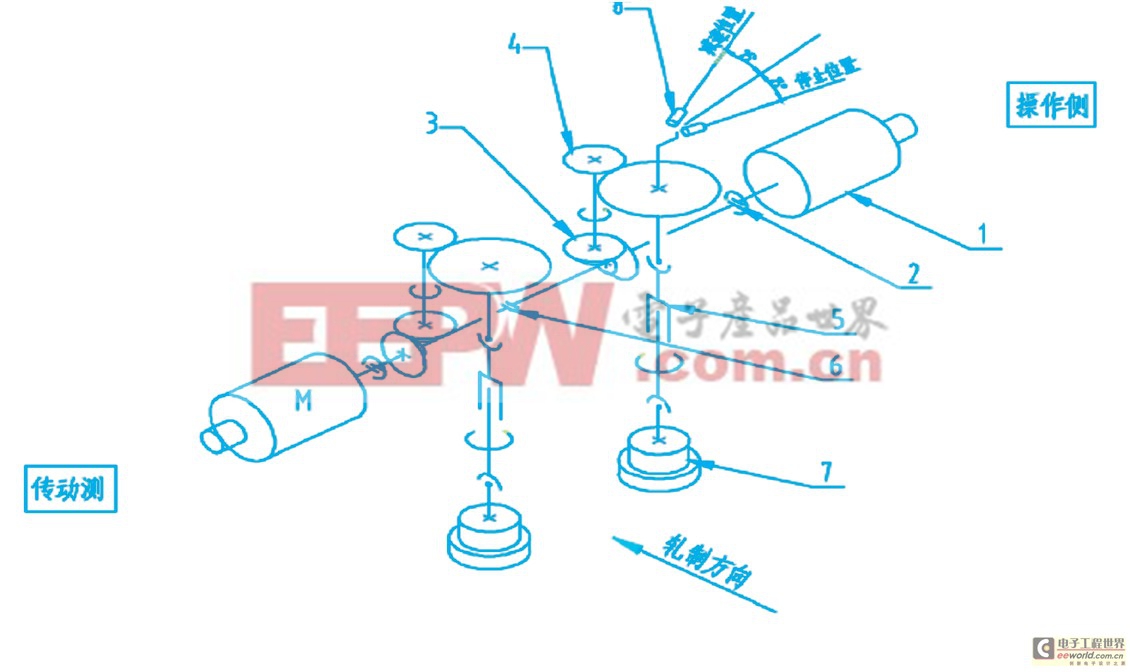 注:1.主电机+编码器(plg);2.联轴器(ⅱ);3.一级锥齿轮付(i=1.955);4.一级圆柱斜齿轮付(i=3.524);5.十字万向接轴;6.联轴器(ⅲ);7.轧辊;8.接近开关。