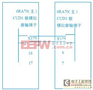 在两个电机严格机械耦合的情况下,操作侧电机为主控制采用速度+电流双闭环控制,传动侧电机为从采用转矩控制,从动装置的斜坡函数发生器和速度调节器不使用,仅仅使用电流调节器。主调节器cudi板x175端子16\17连接两芯屏蔽电缆到从调节器cudi板x174端子6\7,实现装置对装置协议硬线连接,如图4所示。