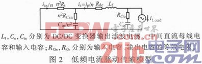 从变换器输出角度来看,可将逆变器负载简化为含800 Hz脉动电流的电流源。电压输入源(蓄电池)用一个内置电阻为Rs的电压源代替。由此,可建立低频纹波电流交流分析模型。当DC/DC变换器工作频率远大于低频纹波脉动频率800 Hz时,可将其等效为一个1:n的理想变压器,由于主要分析的是交流纹波分量,因此可将直流源短路,然后将初级阻抗折算到次级,即可得只含线路阻抗和纹波的交流模型,如图2所示。