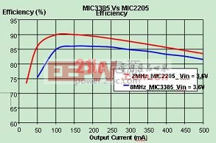 图8:MIC3385与MIC2205的效率比较。