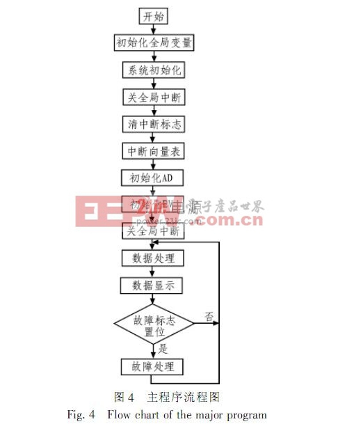 。 在主程序中,需检测系统是否出现过压、欠压、过流故障,如果出现则把相应的标志寄存器置位,当查询到故障标志置位后,切除故障源。主程序流程图如图4 所示。