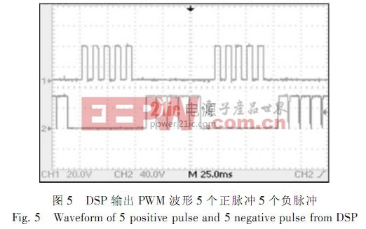 在DSP 开发环境中测试三相全控整流电路输出电压波形,负载两端电压波形。输出5 个正脉冲、占空比50%,5 个负脉冲、占空比90%时的DSP 输出的波形和逆变器带负载时的波形如图5、6 所示。