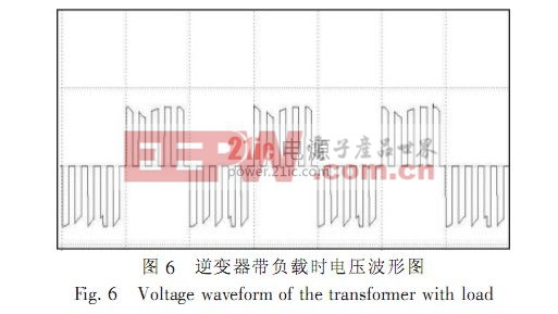 从图中可以看出电源利用TMS320F2812 中的事件管理器,采用SPWM 调制的方式,逆变器输出信号接近于标准的正弦波。加上负载后电压波形出现了畸变,这是由于整流后滤波电容充放电的结果。