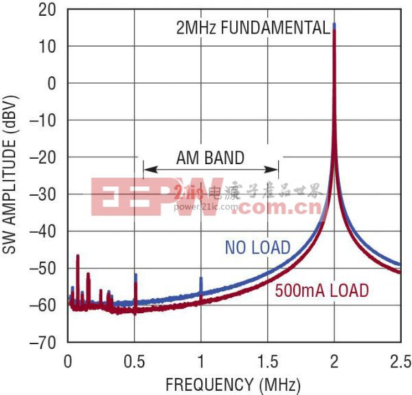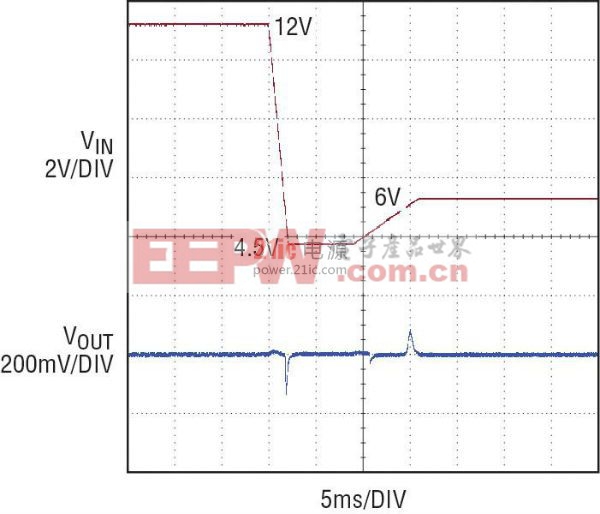 汽车电子系统还必须设计成能承受双电池猛然起动情况,在这种情况下,当用串联连接的第二个电池或具备双电池电气系统的商用车辆猛然启动汽车时,汽车电子系统要在较长时间内承受 24V 电压。汽车总线上的另一种过压情况是由交流发电机稳压器故障引起的,在汽车电子系统 OEM 进行的电池测试中,常常包括对这种过压情况的测试。这种故障可能导致交流发电机的充电电流全部加到电池上,并产生大约为 18V 并持续较长时间的过高电压。 切换大功率负载会引起负载快速变化,汽车电源轨还会受到这种变化导致和持续时间很短的过压瞬态影响,这类大功率负载包括与汽车束线配线中很大的电感相互作用的电动车门、风扇以及冷却风扇电动机。 在大多数汽车中,由低通 LC 滤波器和瞬态电压抑制 (TVS) 阵列组成的无源保护网络被用作第一道防线,以箝制电源总线的峰值摆幅。一般情况下,位于保护网络下游的汽车电子系统必须承受高达 40V 的瞬态电压而不被损坏。关键系统不仅必须承受而且还必须在通过这类瞬态时无缝地工作,并且无中断。图 4 说明,LTC3115-1 能保持 5V 电源轨的不间断调节,以 1ms 上升和下降时间通过 13.8V 至 40V 短暂电压瞬态。 图 4:13.8V 至 40V 负载突降电压瞬态 10V/div:每格 10V 在汽车冷车发动瞬态时无缝工作 高压瞬态在汽车电源总线上是个问题,但是也许更具挑战性的问题是欠压瞬态。最严重的欠压瞬态是由冷车发动引起的,最初启动发动机时,会发生冷车发动情况。 典型的冷车发动电压波形如图 5 所示。最初的稳定低压是最极端的情况,当发动机启动器开始转动完全停止的发动机时,就会引起这种情况。在这个阶段,汽车的总线电压可能降至低于 4V。更冷的温度会使情况恶化,因为机油粘性越大,要求发动机启动器提供的扭矩就越大。第一个稳定期之后,是第二个电压稍高一点的稳定期。在启动器保持发动机转动的同时,第二个稳定电压一般接近标称电池电压的一半。一旦发动机启动完毕,电池就恢复到标称电压。 图 5:12V 至 4.5V 冷车发动电压瞬态 在发生冷车发动瞬态时,安全装置以及发动机的关键组件 (例如: 发动机控制单元、燃料注入系统等) 都要从始至终保持运行。如图 5 所示,在发生欠压情况时,自动和无缝地切换到升压工作模式,LTC3115-1 的降压-升压型架构使该器件能保持输出稳压,因而可通过即使最严重的冷车发动瞬态。 由于当今的汽车包括了自动化节油、按需引擎起/停 (当车辆遭遇红灯或在车流中短暂停驶时,汽车的引擎被关闭) 等功能,因此冷车发动能力对于汽车电子而言其重要性有所增加。配备按需起动功能的汽车容易遇到频繁的欠压发动过程。因此,以前在传统汽车偶尔的冷车发动过程中无需运行的辅助电气组件,如今也必须在此类瞬变期间运作,以消除其对信息娱乐、导航、仪表板电子装置和照明系统的任何干扰。 低 EMI 且在 AM 频段无辐射 LTC3115-1 具有一种低噪声强制 PWM 模式,两个开关引脚在该模式中均工作于恒定频率 (对于任何负载都是如此),因而产生了一种与工作条件无关的低噪声频谱。可预知的频谱和极少的次谐波辐射可帮助降低干扰并有助于符合严格的汽车 EMI 标准。 LTC3115-1 支持高达 2MHz 的开关频率,这样基础开关频率分量及其所有谐波均可位于 AM 频段以上,以最大限度地减少对无线电接收的干扰。当图 2 所示的汽车应用电路在无负载及具有一个 500mA 负载的情况下运作时,LTC3115-1 在 AM 频段上的频谱辐射示于图 6。在这两种场合中 AM 广播频段之内的整个频率范围均未遭受任何显著的频谱辐射。 图 6:固定频率低噪声 PWM 可最大限度地减少 AM 频段上的辐射 SW AMPLITUDE:SW 幅度 2MHz FUNDAMENTAL:2MHz 基本开关频率 AM BAND:AM 频带 NO LOAD:无负载 500mA LOAD:500mA 负载 FREQUENCY:频率 应对多个电源 —— 未稳压交流适配器、汽车输入、USB、USB-PD 和 FireWire 为了提高灵活性和提升用户体验,很多便携式电子设备都设计成可配合不同的电源工作。这些电源之间的电压可能相差很大,尤其是考虑到连接器和电缆压降时。 在 USB 3.0 情况下,标称供电电压为 5V ±5%,但是考虑到可允许的电缆和连接器压降时,完全符合要求的受电设备必须能在低至 4V 时工作。此外,在瞬态情况下,例如当更多设备插入主机或受电插座时,允许下游 USB 电源轨降到低至 3.67V。 新批准的 USB PD (功率传送) 规范允许比 USB 高的功率传送,支持高达 20V 的电源电压。Firewire 端口提供未稳压电源轨,其电压在很大的范围内变化,视供电设备类别的不同而不同,
