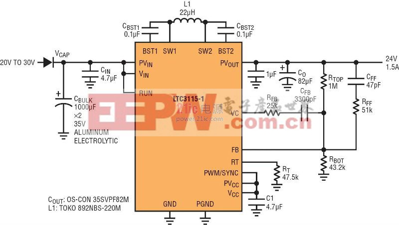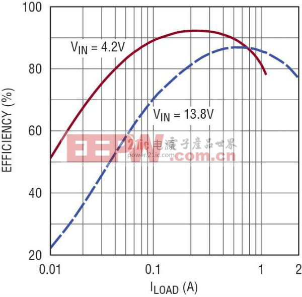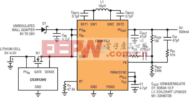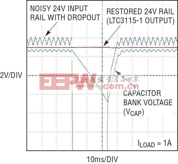 一般在 9V 至 26V 之间。 普及的交流适配器也许仍然是便携式设备最常见的电源。典型的交流适配器只是一个变压器,其后跟着一个桥式整流器,从而提供了非有源调节。而该任务就留给了终端设备,以避免电缆压降的影响。未稳压交流适配器设计成以规定的典型输出电压提供额定电流。由于输出电压是未稳压,所以输出电压是负载电压的函数,在较轻负载时大幅提高,在重负载时会下降。此外,AC 线电压允许在 105V 至 125V 之间变化,从而在未稳压交流适配器输出额外增加了 10% 的变化。一个 12V 的未稳压交流适配器在轻负载时产生 17V 或更高的输出电压并非不常见。 LTC3115-1 可直接用所有这些便携式电源以及各种化学组成的电池工作,电池包括锂 (单节或串联连接的)、密封铅酸、3 节或更多节串联的碱性电池、甚至超级电容器组以适用于备份应用。多个电源可以通过肖特基二极管“或”电路组合在一起。 为了实现更高的效率,通过用低压差 P 沟道功率 MOSFET 取代肖特基二极管,LTC3115-1 可与理想二极管电源通路 (PowerPath) 控制器相结合,以在多个电源之间实现自动切换。图 7 显示了 LTC3115-1 怎样才能与 LTC4412HV 相结合,以获得由单节锂离子电池和未稳压交流适配器提供的双输入 5V 电源。在图 7 情况下,较低电压的锂离子电池输入端采用了一个串联 PMOS,同时较高电压输入端采用了廉价的肖特基二极管,在这里,肖特基二极管的压降微不足道。图 8 就每一个电源输入,给出了这个电源 (包括转换器和电源通路) 的总体效率。 图 7:为了实现高效率,这个双输入 5V 电源在电池通路中采用 LTC4412 低损耗电源通路 (PowerPath™) 控制器和 P 沟道 MOSFET 取代了肖特基二极管。廉价肖特基二极管用在较高电压输入端,在这里,肖特基二极管的压降微不足道。 UNREGULATED WALL ADAPTER:未稳压交流适配器 8V TO 28V:8V 至 28V LITHIUM CELL:锂离子电池 图 8:电源通路和 LTC3115-1 的总体效率 EFFICIENCY:效率 24V 工业轨恢复器及备份 工业控制和监视系统常常采用 24V 总线为 DIN 方式连接的仪器供电,例如可编程逻辑控制器、起动器和传感器。由于这类总线会遭遇大功率开关负载和可能的故障情况,所以可能在瞬态以及短暂欠压瞬态时出现讹误。在严重情况下,总线供电甚至可能短暂中断。在这类情况发生时,要求依然保持为关键的轨供电系统供电,以确保对关键功能的控制和监视。 此外,在总线出现故障后,很多设备必须保持工作一段时间以启动受控的停机。图 9 所示 LTC3115-1 应用是一个 24V 轨恢复器应用,可从带噪的输入电源轨提供一个干净和良好稳定的 24V 输出轨,该输出轨在稳定目标上下波动。另外,从图 10 所示的波形中看出,在总线电源短暂中断时,这个电源能保持稳定的 24V 输出。 图 9:电压过低情况下的 24V 工业轨恢复器 ALUMINUM ELECTROLYTIC:铝电解质 图 10:LTC3115-1 在输入电压过低时调节输出轨 NOISY 24V INPUT RAIL WITH DROPOUT:具压差的г 24V 输入轨 RESTORED 24V RAIL (LTC3115-1 OUTPUT):恢复的 24V 轨 (LTC3115-1 输出) CAPACITOR BANK VOLTAGE:电容器组的电压 结论 LTC3115-1 的灵活性和高效率使该器件非常适用于满足要求苛刻的新一代汽车电子系统和便携式设备的需求,尤其是那些能用多种电源工作的设备。该器件内部的电源开关和可编程开关频率最大限度地减小了电源解决方案的占板面积,从而满足了便携式设备及汽车领域日益增加和对电子器件微型化的需求。在以突发模式工作和停机时,LTC3115-1 的静态电流很低,这延长了电池寿命,方便了在始终工作的汽车应用中的使用。 LTC3115-1 提供低噪声、固定频率 PWM 模式,非常适用于噪声敏感型应用,该模式产生可预测和受到良好控制的 EMI 频谱,开关边沿可以同步至一个系统时钟。在启动时,内部软启动最大限度地减小了浪涌电流,控制通路中的内部分压器减轻了输入电压变化的影响,而且在输入电压变化范围很大的应用中,使环路很容易得到补偿。可编程输入欠压闭锁允许启动该器件的输入电压由用户设定,并允许对迟滞的独立控制。LTC3115-1 在停机时能彻底断开输出与输入的连接,而且凭借输出短路保护和过热停机,还能得到全面保护。