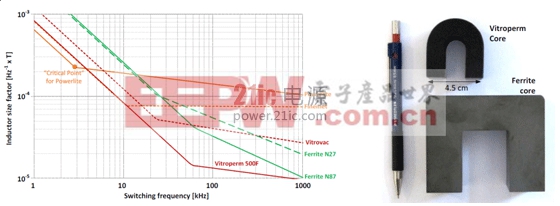 关频率。 在达到指定的临界点(在 100mW/cm 时定义的特定损耗3)后,需要降低峰值磁通量以避免过热,从而在该点之外运行将不会导致其大小显著减校 频率一定时,Vitroperm500F 可在所有材料中实现最佳性能。 图 2. 用作频率函数的不同芯材的电感器大小,以及与 Vitroperm 和铁氧体磁芯的大小比较 图 3 显示了测得的效率级,包括采用两阶段解决方案的驱动损耗。 根据计算得出的损耗分布如下图曲线所示。 该系统可以在没有达到临界温度或饱和度的情况下达到高电流负载。 该两阶段驱动解决方案会将驱动损耗降低至输入功率的 0.02% 左右。 整体损耗更低使得所需的散热片尺寸减小,且更高的开关频率允许使用更小的过滤器元件。 所有这些特性最终有助于降低系统成本。 图 3. 48 kHz 时的效率和驱动损耗,以及原型图 结论 碳化硅赋予 BJT 新的生命。 与基于硅的前代产品不同,碳化硅 BJT 可实现低传导损耗、高击穿场强度,并且可在更广泛的温度范围内稳定运行。 在驱动器电路中使用两个电源电压,可降低驱动损耗,实现良好效率。 更高的开关频率允许使用更小的电感器,从而在系统级实现显著的成本节约。 高压应用(如光伏逆变器)将受益于高功率密度、更低系统成本和简易的设计,因此 SiC BJT 成为极具吸引力的替代产品。