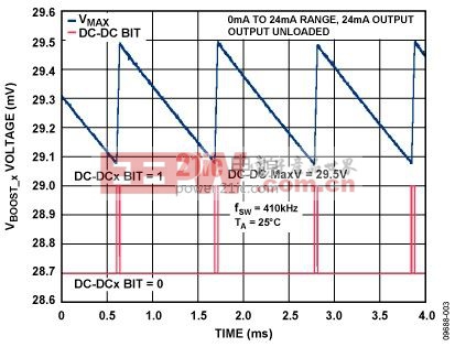 最大VBOOST_X电压在DC-DC控制寄存器中设置。达到该最大电压时,DC-DC转换器被禁用,VBOOST_X电压则下降约0.4 V。当VBOOST_X电压下降时,DC-DC转换器被重新启用,电压斜坡再次升到VMAX(若仍有必要)。