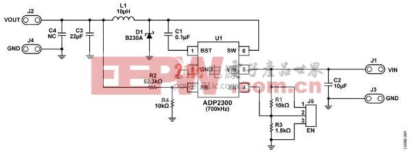 ADP2300和某些分立元件用于创建简单的5 V电轨,满足AD5755如前所述的电源电流要求。通过输出电压与FB引脚之间的一个电阻分压器(见图4),可从外部设置输出电压。