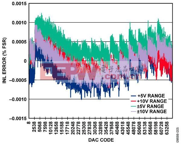 所有测试数据均来自EVAL-AD5755SDZ、EVAL-SDP-CB1Z和ADP2300-EVALZ板。使用ADP2300的系统积分非线性(INL)、差分非线性(DNL)和总非调整误差(TUE)分别见图5、图6和图7。AD5755升压调节器在所有测量过程中均处于工作状态。