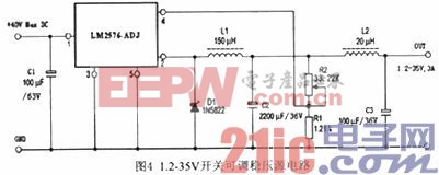 电路中用LM2576-ADJ开关型稳压集成电路制作的1.2~35V可调稳压电源,如图4所示,可知输出电压与分压网络(R2/Ri)的反馈电压有关, 它们之间满足: