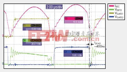 图7所示为这种控制方式。在过程开始时获取信息作为控制MOSFET关断的方法,这种方法使GATE较早关断,以防止由于某些原因而造成MOSFET晚关断。在MOSFET导通且受到噪声和连线的一些干扰时,这种方式比直接检测VDET上微小负电压的方式更加稳定。由于电流低至0A,tDEAD的周期(从GATE关断的定时到IDS的定时)将变长,减低同步整流器的活动性可以改善能效。