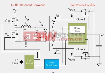 使用LLC谐振转换器初级端栅极信号的同步控制是最直接的控制方法。使用由初级高侧和低侧信号计算而来的GATE信号,并将结果提供给次级端,控制相应的次级端MOSFET的导通和关断。如图8所示,处理高侧和低侧的额外信号后,使用逻辑电路发送信号来控制次级端的MOSFET。注意,VHG和VLG的信号不能直接从计算导出,最有效的方法是使用LLC的信号来生成VHG和VLG信号,控制初级端的MOSFET。因为在大多数情况下,相应的次级端MOSFET需要早于初级端MOSFET关断,原始的LLC控制信号不能直接驱动MOSFET,必须发送一个新信号。