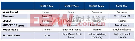 最后,表1给出了四种检测方法。从逻辑上讲,当MOSFET导通时,就控制而言,检测电流会比检测VDET容易。最复杂的方法是与LLC信号同步,这要求增加功能,以改善I区域和II区域的情况。检测电流需要使用电流互感器(CT),而使用初级端LLC的信号则需要电压互感器(PT)。因此,各种因素更加难以控制。在布局设计过程中,设计人员在确定电流互感器的电流检测方法以及MOSFET非常精确的RDSON电压时必需非常仔细。因为检测到的RDSON电压大约为1mV至10mV,所以更易受到干扰。采用通过PT发送同步信号的初级端LLC信号方式,要求设计人员考虑噪声问题。