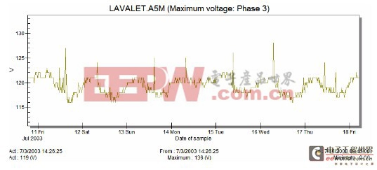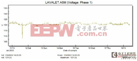 上图所示:某电压在连续7天内的变化,在第1天出现了1次电压短暂跌落。您可能会问,如果电压随时都在变化,为何用电设备没有随即出现故障?其原因是,电子设备的电压适应范围是正常电压的±10%。而且,设备类型不同其承受电压变化的持续时间也不同。电压的首次变化不一定使设备损坏,但如果电压波动持续时间过长或电压事件频繁出现,超出了设备的耐受能力,设备就会损坏。