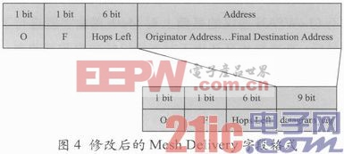 从适配层分片报文格式可知,除了第一片外,后续分片的Mesh Delivery字段都要添加适应层源地址和适应层最终目的地址,这样就无形中大大增加了网络的负载。为了减少负载,可以对后续分片进行修改。由于后续分片和第一片的适应层源地址和适应层最终目的地址完全相同,因而可以取消后续片的地址字段。为了不改变原来的选路功能,可用datagram_tag字段取代地址字段,把原来较长的Mesh Delivery地址字段改成仅需9 b的datagram_tag字段,这样就减少了后续分片所增加的负载,提高了网络的利用率。在进行选路时,可通过读取datagram_ tag字段获取地址,由于后续片的datagram_tag字段值和第一片相同,所以,就可通过该字段获取第一片的地址,这样就能实现选路功能。修改后的Mesh Delivery字段格式如图4所示。