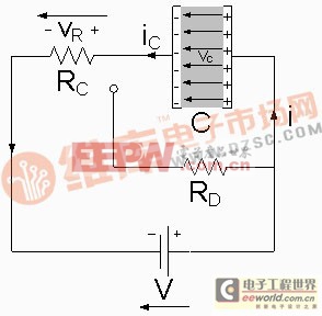 当切断电容和电源的连接后,电容通过电阻RD进行放电,两块板之间的电压将会逐渐下降为零,VC= 0,见图4。