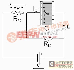 若电容与直流电源相接,见图3,电路中有电流流通。两块板会分别获得数量相等的相反电荷,此时电容正在充电,其两端的电位差VC逐渐增大。一旦电容两端电压VC增大至与电源电压V相等时,VC= V,电容充电完毕,电路中再没有电流流动,而电容的充电过程完成。